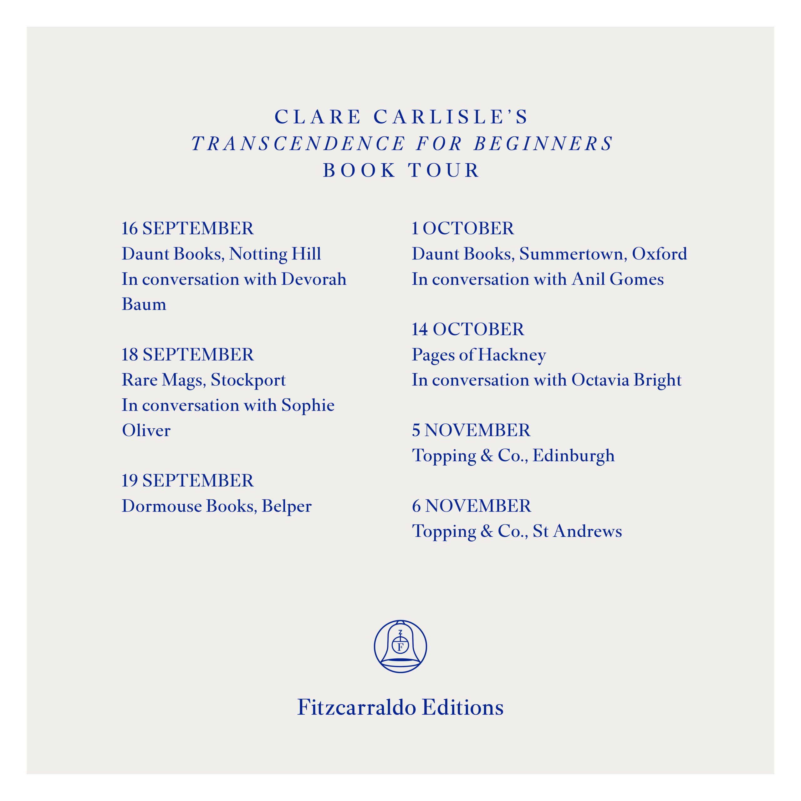 Clare Carlisle, author of Transcendence for Beginners, will be on tour this autumn. Please see below for details and links to each event.