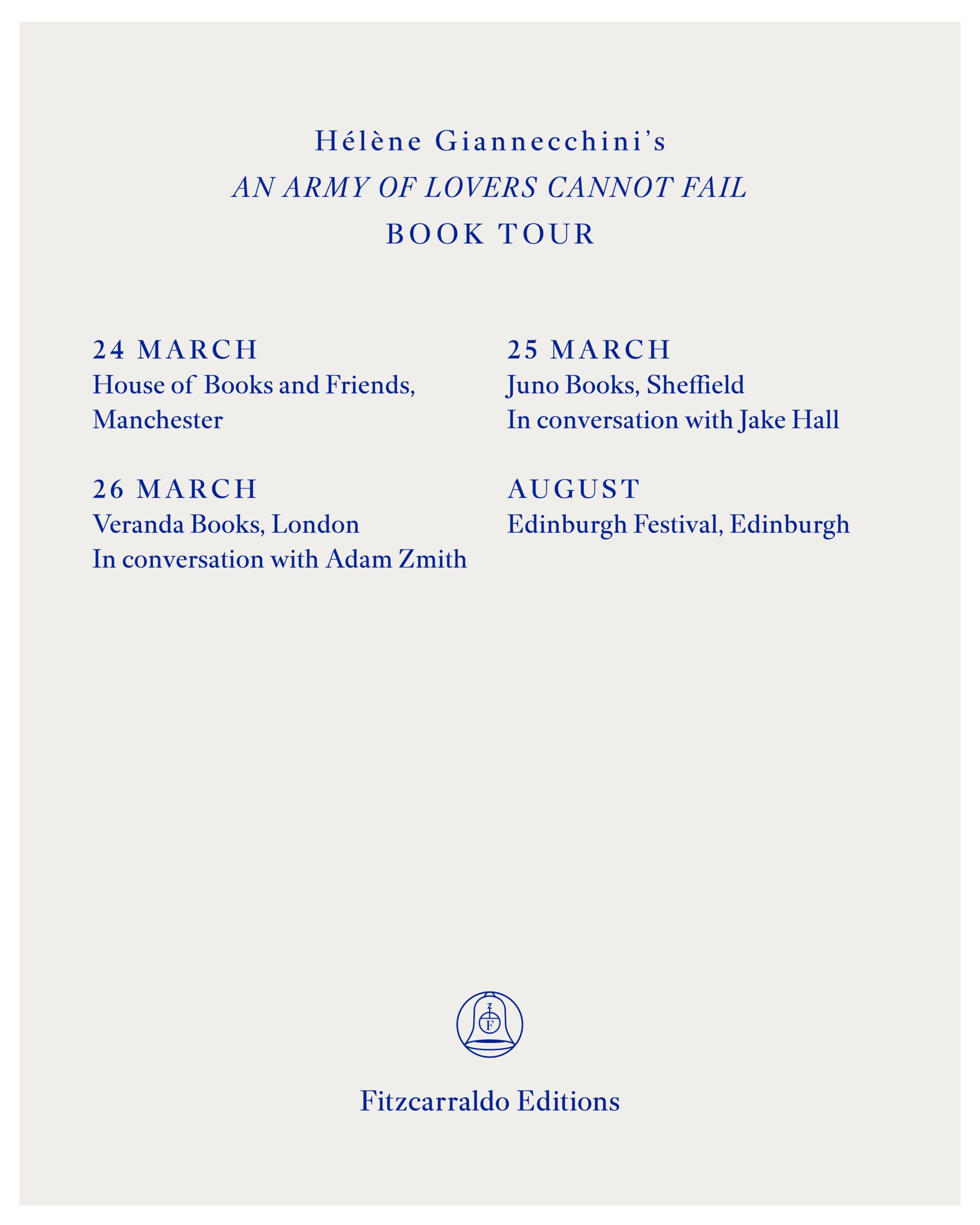 Hélène Giannecchini, author of An Army of Lovers Cannot Fail will be on tour in 2026. Please see below for details and links to each event.